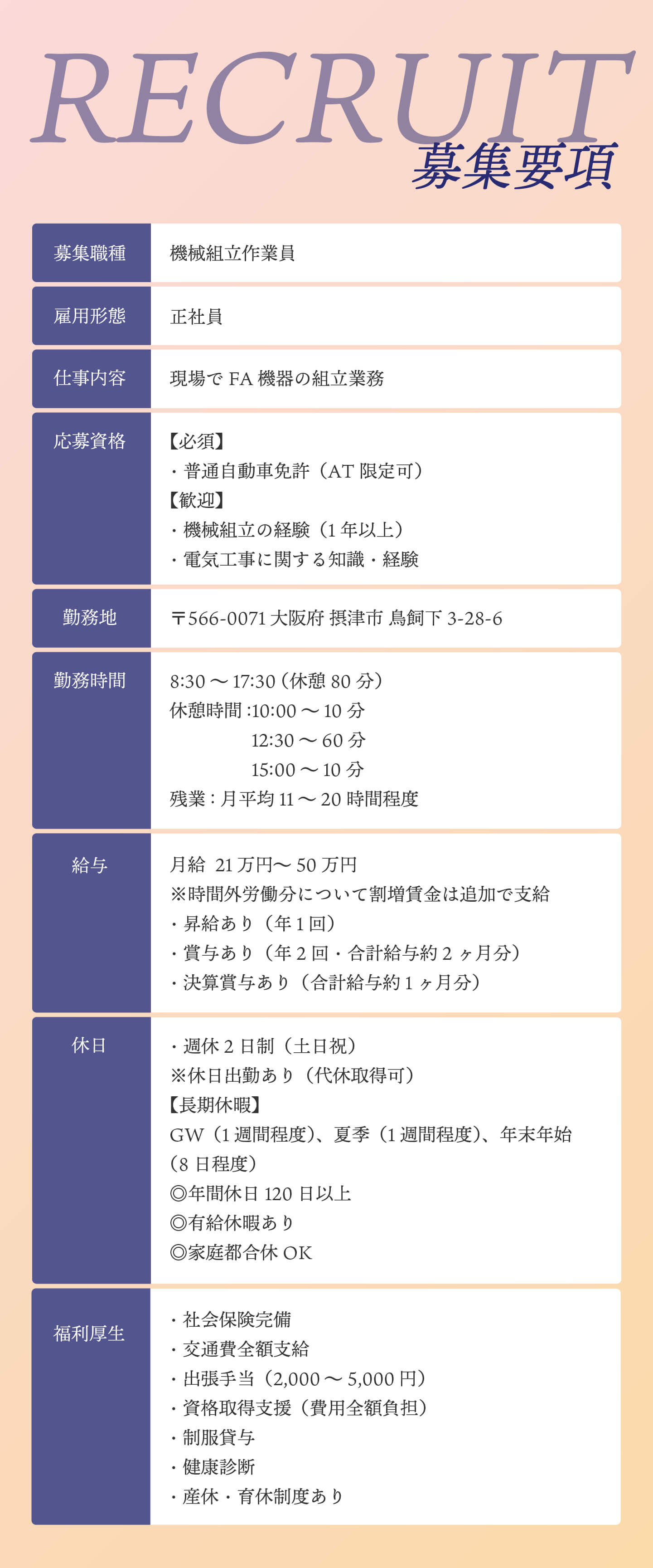 | 事業内容 | FA機器の設計、製造、販売 装置の設計、製造、販売 |